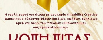 Ο Σύλλογος Φίλων Παιδιών, Εφήβων, Ενηλίκων ΑμεΑ και όλων των παιδιών «Εθελοντούμε» και η σχολή χορού για άτομα με αναπηρία thisability Creative Dance σας προσκαλεί στην κοπή της πίτας τους!